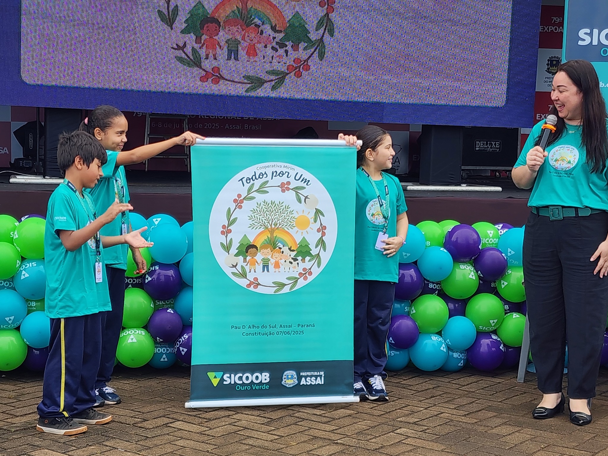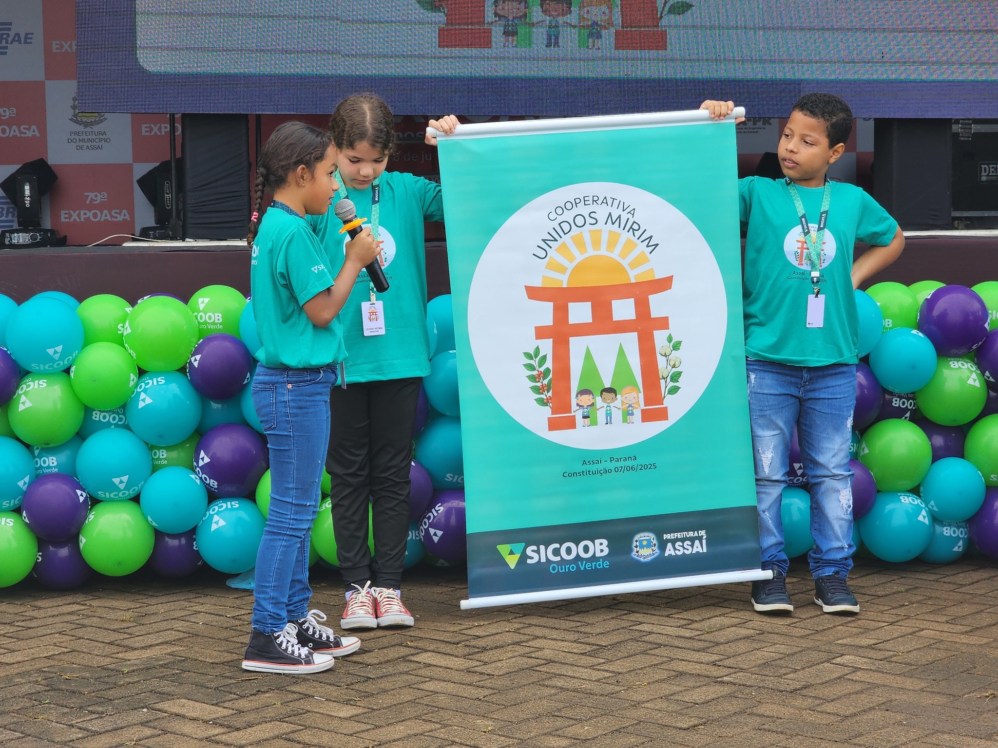 Na 79ª Expoasa, Assaí e Sicoob criaram duas cooperativas mirins nas escolas Padre França Wolkers e Rotary Club, promovendo educação financeira, cooperativismo e cidadania entre crianças, fortalecendo valores como solidariedade e trabalho em equipe.