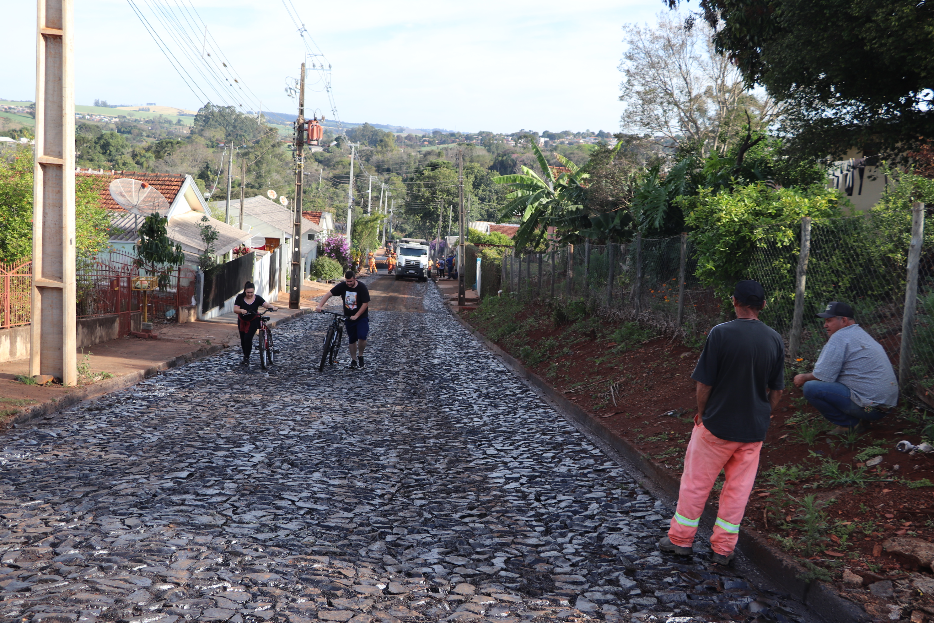 A Prefeitura deu início às obras, que foram concluídas no sábado, dia 13 de agosto, quando crianças, jovens e adultos observavam o movimento das máquinas e das equipes asfaltando e recapeando.