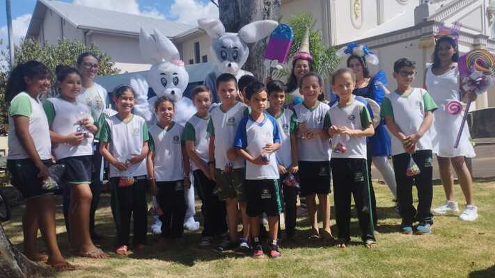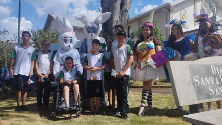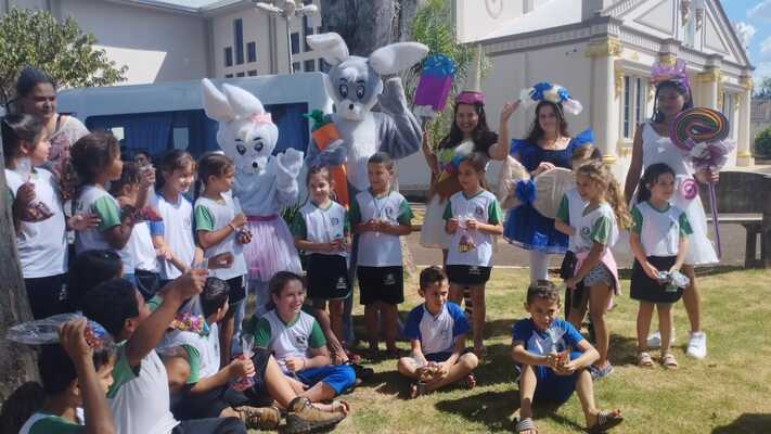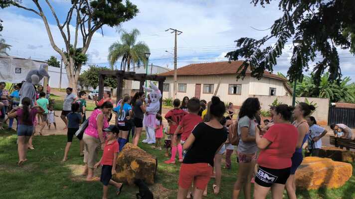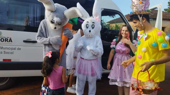 O Coelho e a Turma da Páscoa foram responsáveis por realizar a entrega dos doces e levar alegria para as crianças nas praças dos respectivos distritos.