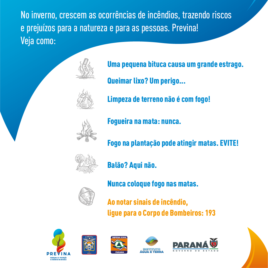 O Programa de Prevenção de Incêndios na Natureza (Previna), promovido pela Secretaria de Estado do Desenvolvimento Sustentável e do Turismo (Sedest) e apoio do Instituto Água e Terra (IAT), tem como objetivo fornecer meios para a prevenção e o combate a incêndios florestais nas Unidades de Conservação do Paraná, garantindo a preservação dos patrimônios ambientais do Estado.