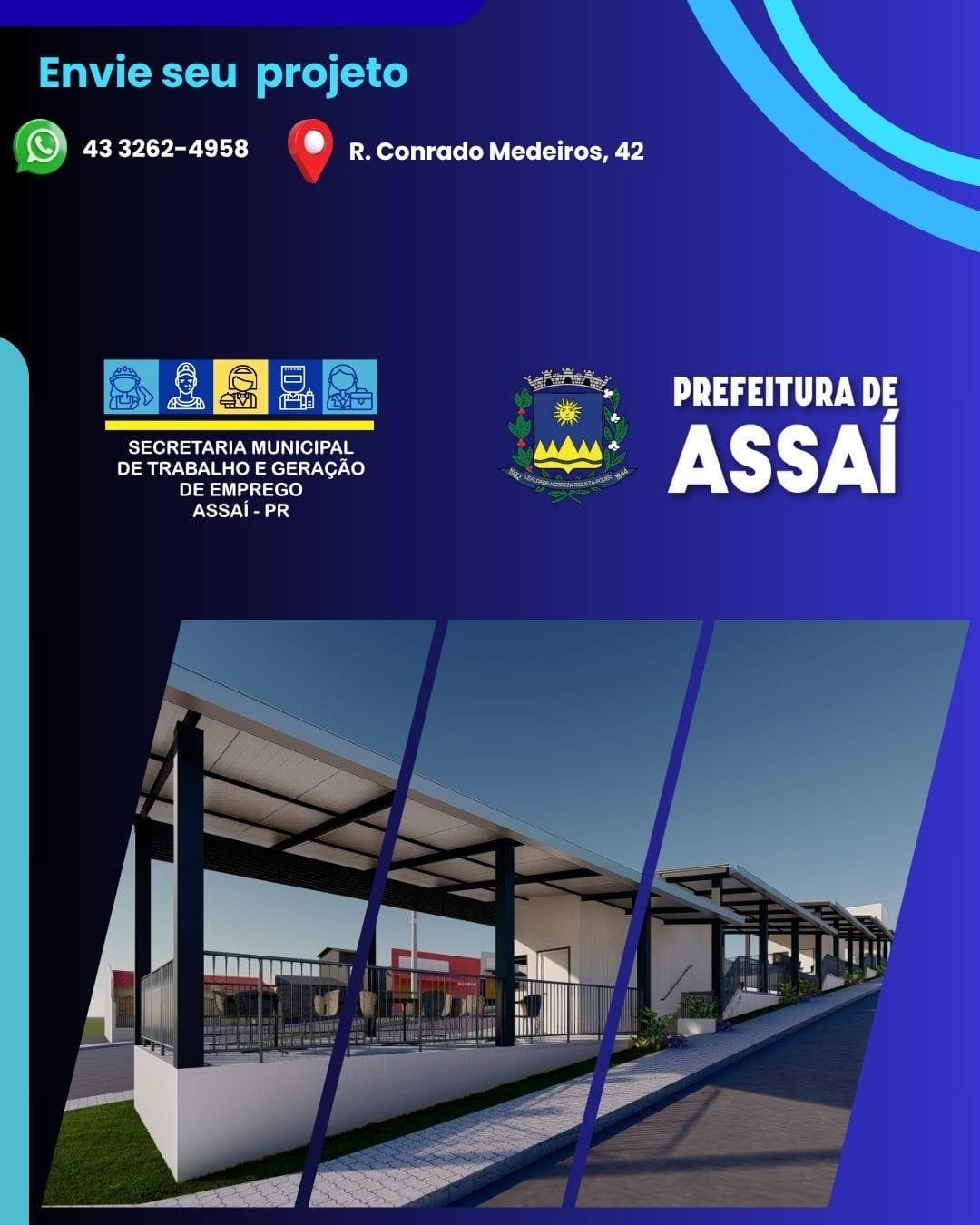 Os projetos deverão ser enviados para a Secretaria de Trabalho pelo Whats'App 43 3262-4958 ou podem ser entregues pessoalmente na Rua Conrado Medeiros, 42 - Centro - Assaí/PR.