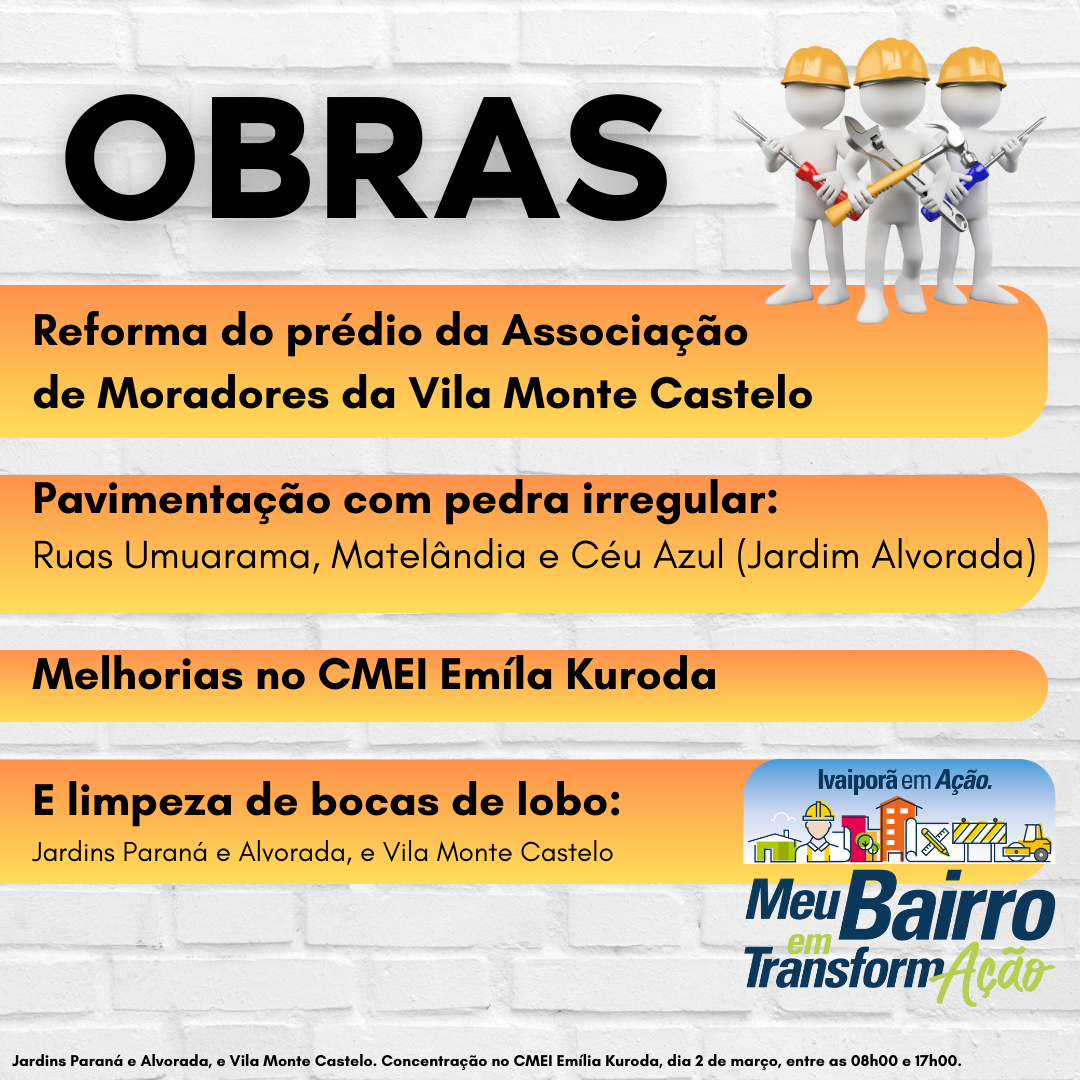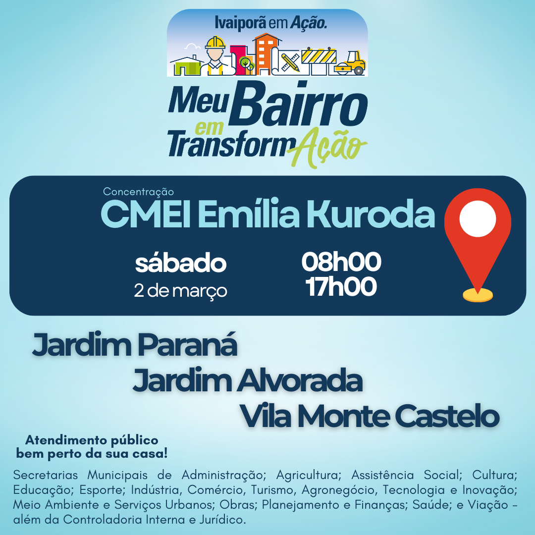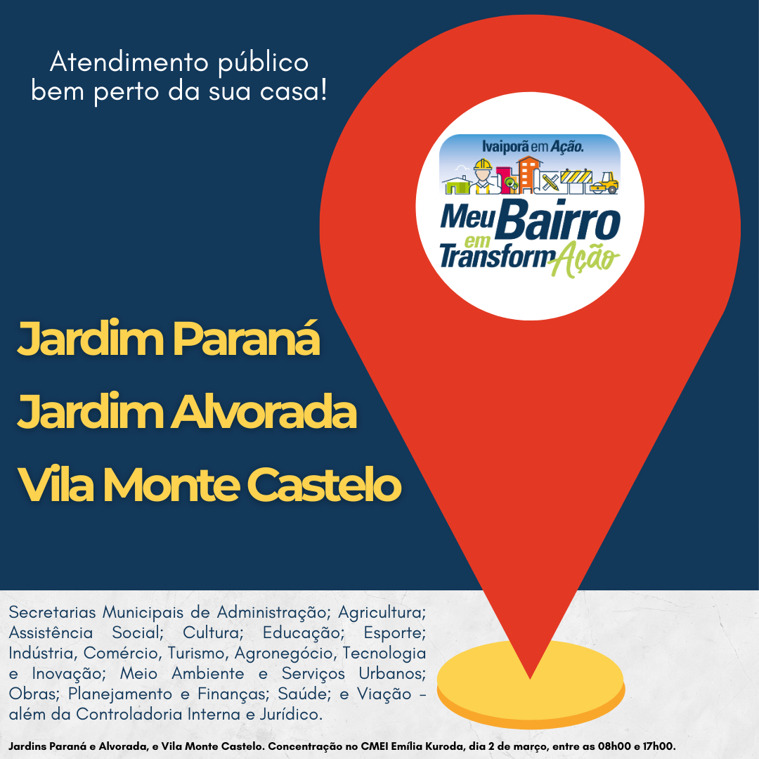 No sábado, dia 2 de março, a Prefeitura de Ivaiporã realizará o programa Ivaiporã em Ação – Meu Bairro em Transformação, entre as 08h00 e 17h00, levando uma série de serviços públicos descentralizados para os moradores dos Jardins Paraná, Alvorada e da Vila Monte Castelo.