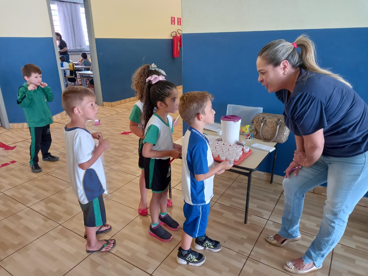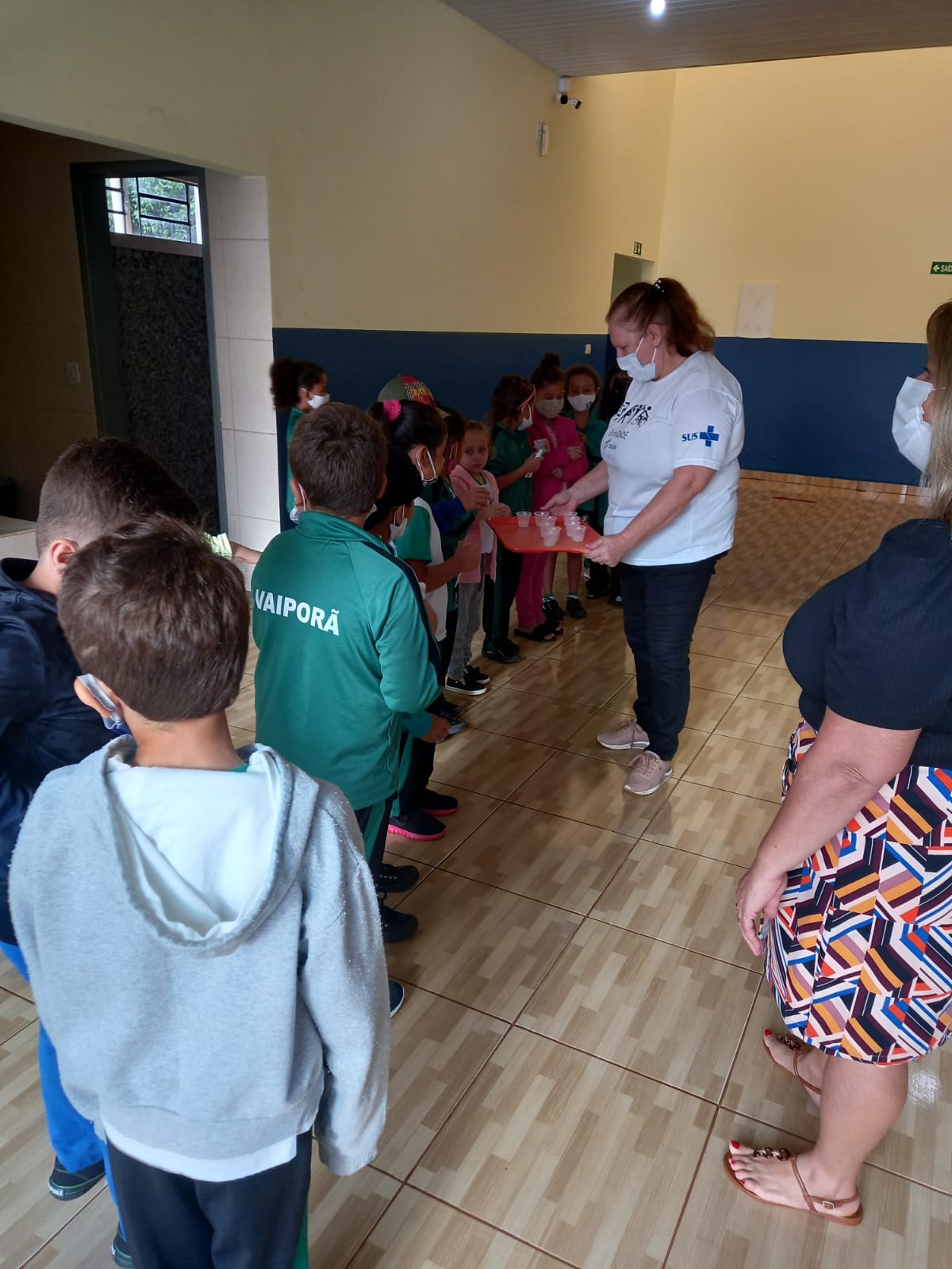 O objetivo dessa atividade é essencialmente qualitativo, visando aprimorar as habilidades dos educandos no uso da escova para desorganizar o biofilme dental. A equipe realiza o bochecho com flúor nas crianças após a escovação.
