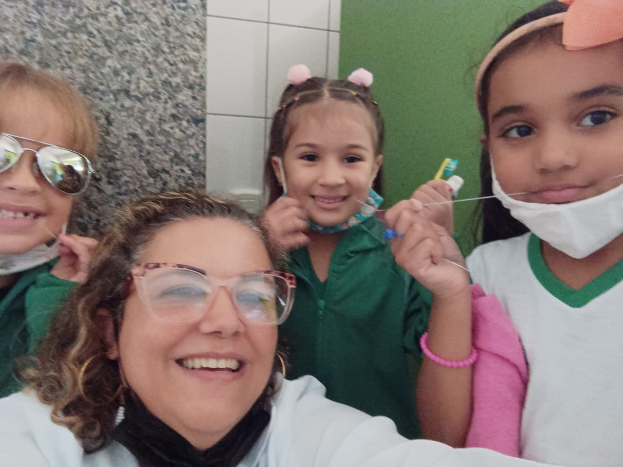 A escovação dental supervisionada direta, com orientação/supervisão de um profissional é realizada com frequência mensal pelas ASBs e ACSs e semestralmente também com cirurgião-dentista que aproveita sua presença na escola para realizar palestra, distribuir escovas dentais e capacitar os colaboradores. O material de apoio usado para desenvolver essas atividades é: escova dental, creme dental, fio dental, espelho grande, macromodelo e pia com torneira.