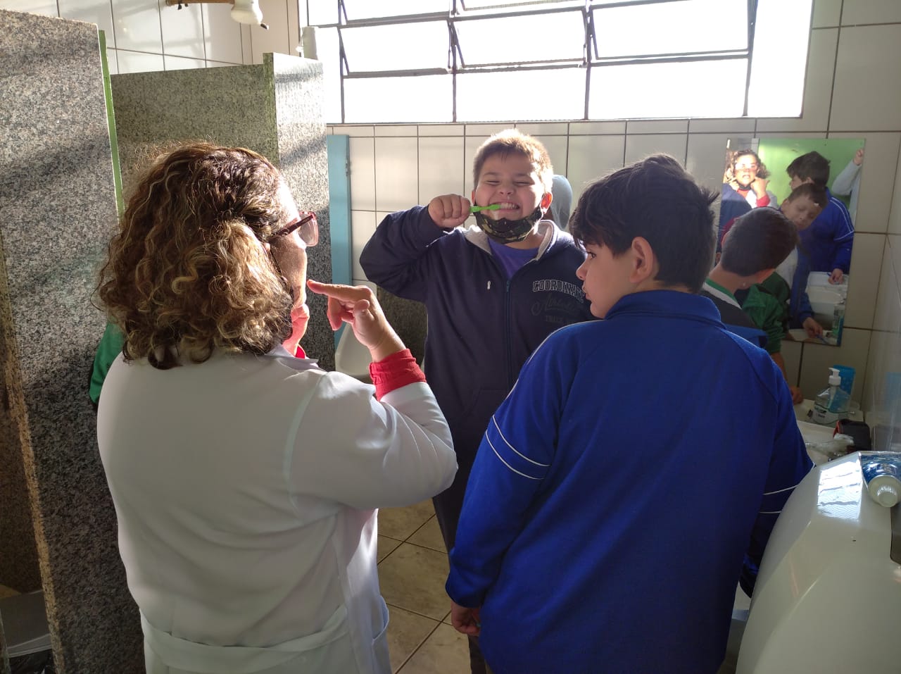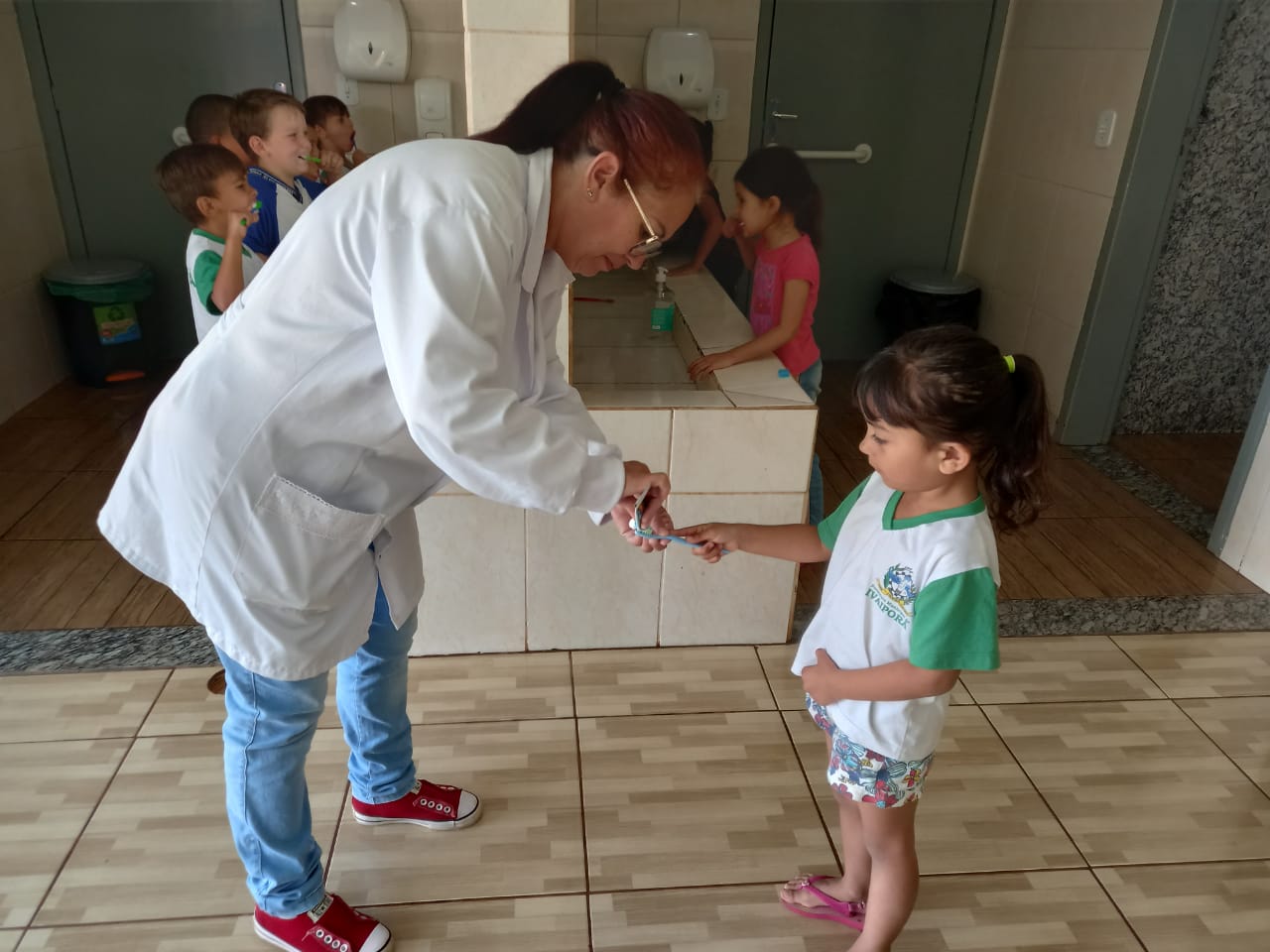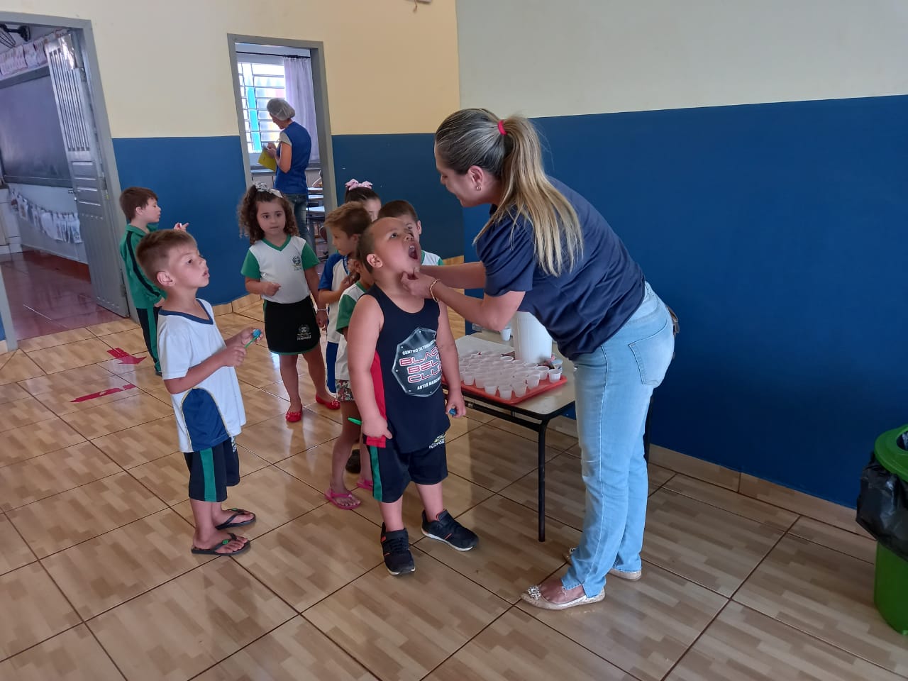 A escovação bucal supervisionada indireta deve ser realizada no ambiente escolar. Algumas escolas do município realizam semanalmente, outras mensalmente após a alimentação oferecida nas escolas.