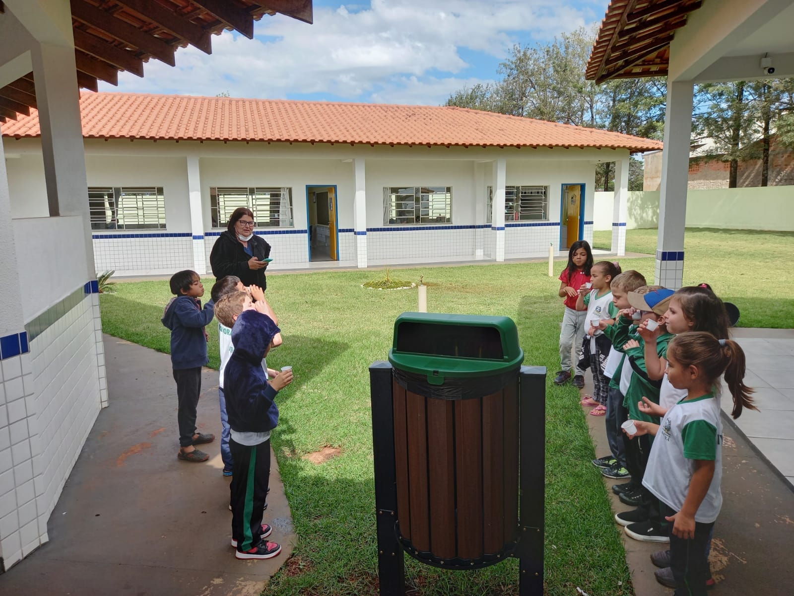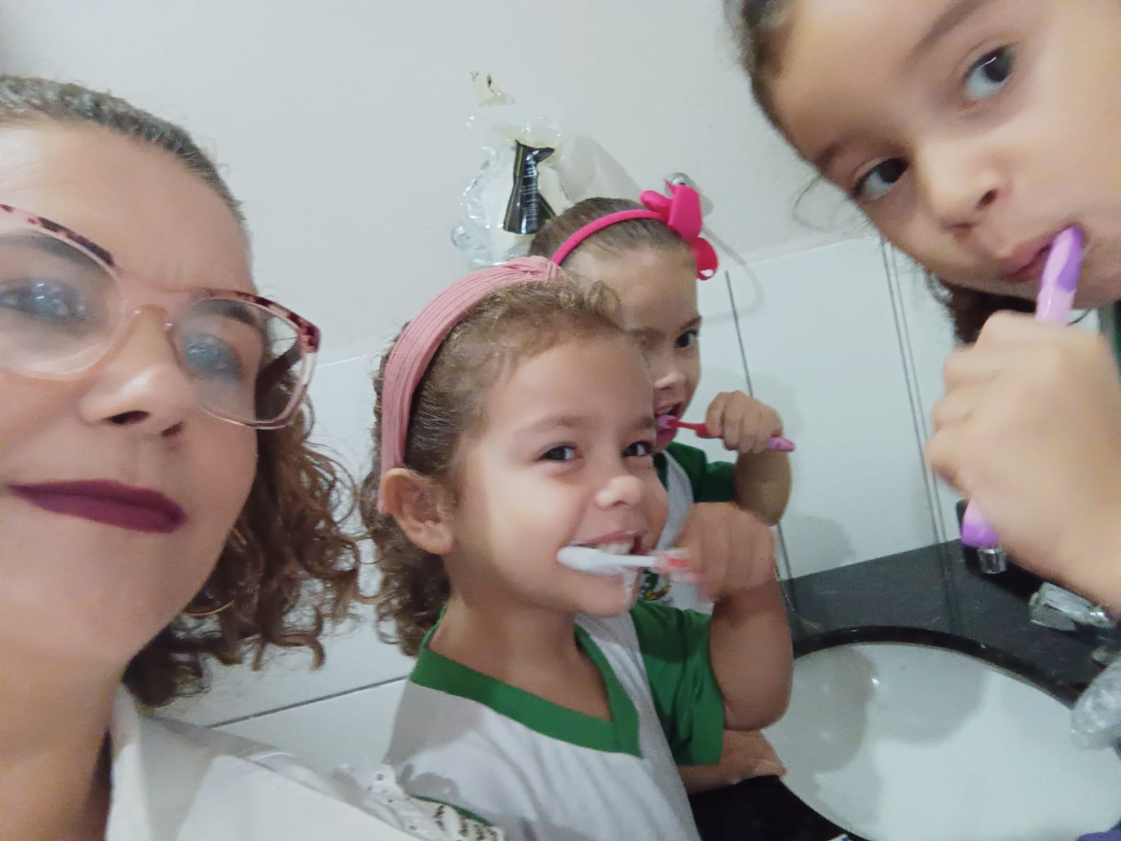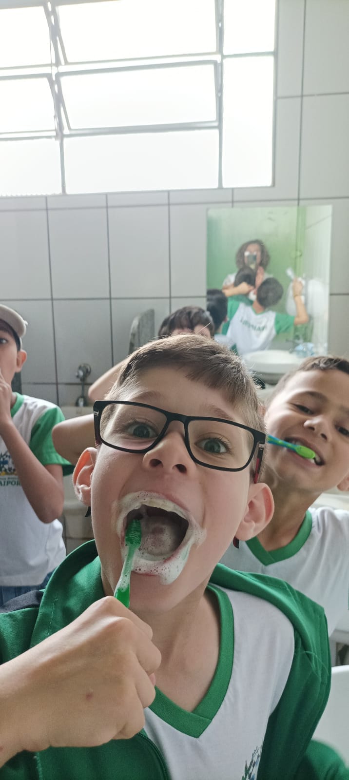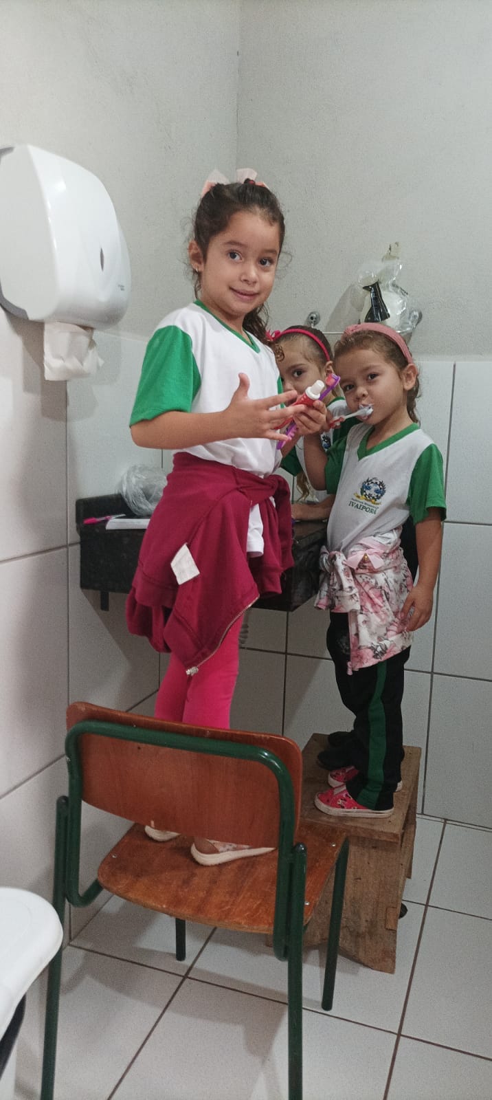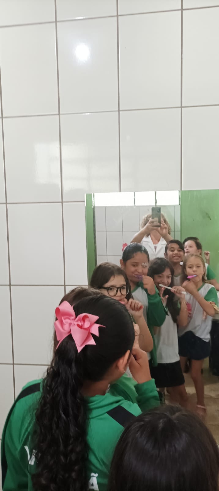As crianças recebem atendimento, orientações sobre higiene bucal e dieta, e participam da escovação supervisionada.