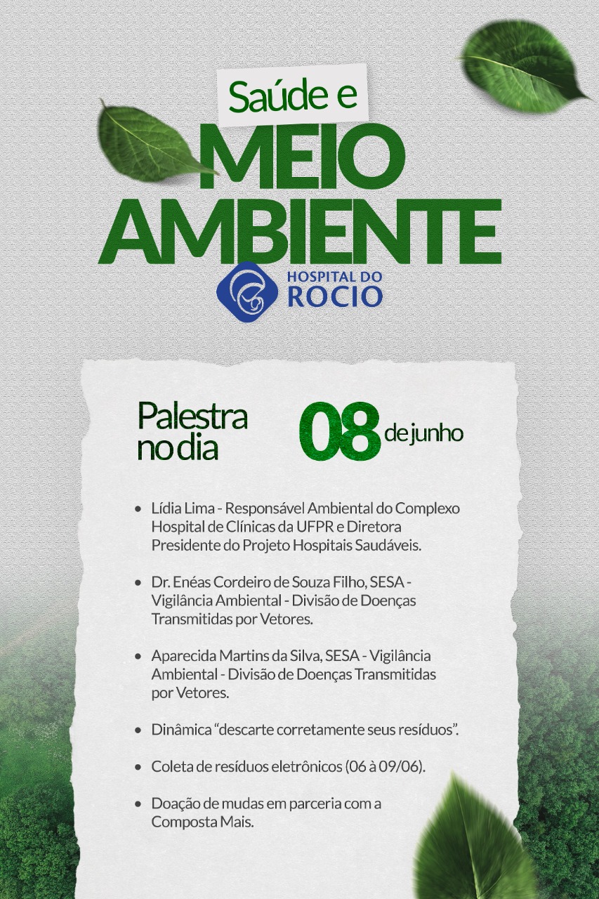 Em comemoração ao Dia Mundial do Meio Ambiente (05/06), o Hospital do Rocio realizou a Semana do Meio Ambiente, com ações voltadas à conscientização sobre o descarte correto dos resíduos, palestras sobre a temática: “Saúde e Meio Ambiente”, coleta de resíduos eletrônicos e doação de mudas.
