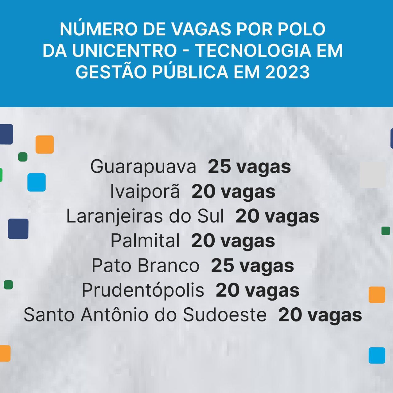 Para o Polo de Apoio Presencial de Ivaiporã foram destinadas 20 vagas para o curso de Tecnologia em Gestão Pública ofertado pela UNICENTRO. As vagas são destinadas para servidores públicos e população de modo geral. O tecnólogo em gestão pública é um profissional que está capacitado para atuar me diferentes áreas da administração pública como também em organizações da sociedade civil.